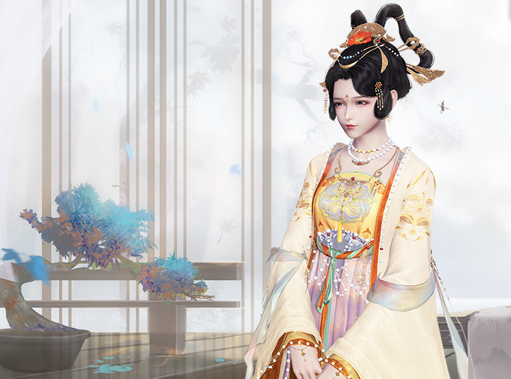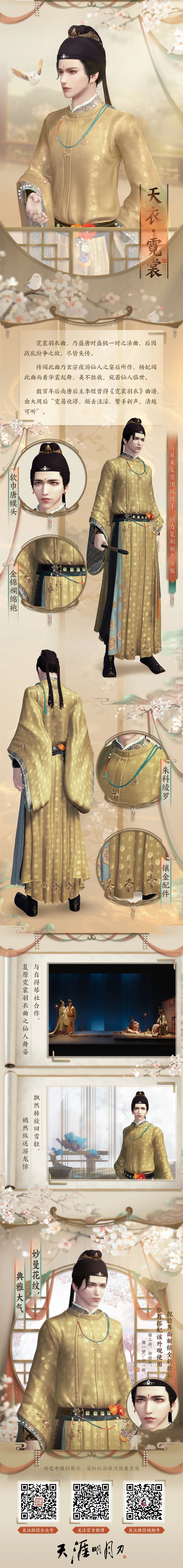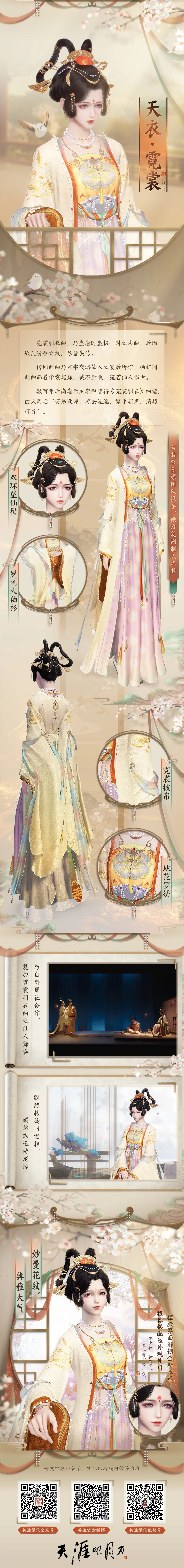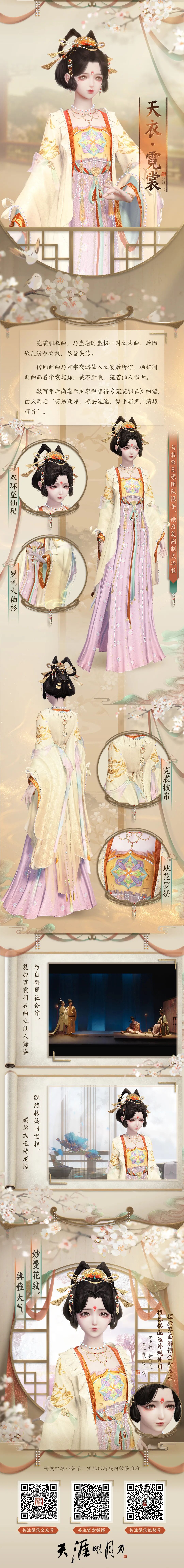从古至今,无数能工巧匠做出了一次又一次尝试,希望能还原自己想象中的“神仙之衣”。刀刀岂敢落后,特地邀请了装束复原团队精心设计,以南唐后主之妻大周后周娥皇为原型,将传说和五代南唐的贵族妇女装束史实结合,以制作出属于刀刀和各位江湖少侠的“霓裳羽衣”。