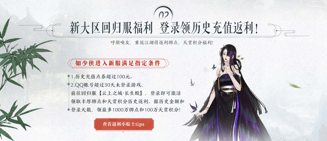全新大区“云上之城-长生殿” 12月25日12:00开启,相约新服,前往预约新大区即得永久圣绣·白凤、10000绑点、点染自选礼等海量好礼,绑定手机还能再领5000绑点!满足条件的账号前往回归服“云上之城-长生殿”,登录即可激活并领取丰厚绑点和天赏积分历史返利,最多可至1000万绑点和100万天赏积分!