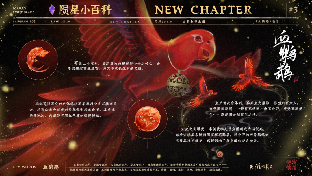 自化清寺大佛顶起,天刀IP走过了六年岁月。第一个三年,是“孔雀翎”主题,落笔于江湖。第二个三年,是“大悲赋”主题,着眼于天下。而接下来,以血鹦鹉为主题叙事的长线,昭示着天刀IP3.0篇章的开启。在天刀IP3.0的设定上,天刀依旧采取端游手游双线并进的形式进行。云上之城,便是天刀IP3.0的核心内容之一。在游戏中,玩家将勇闯白玉京储藏盛唐陨石的“云上之城”,参与到神秘莫测的“馥郁之战”中,体验带有科幻色彩的武侠世界中的故事。