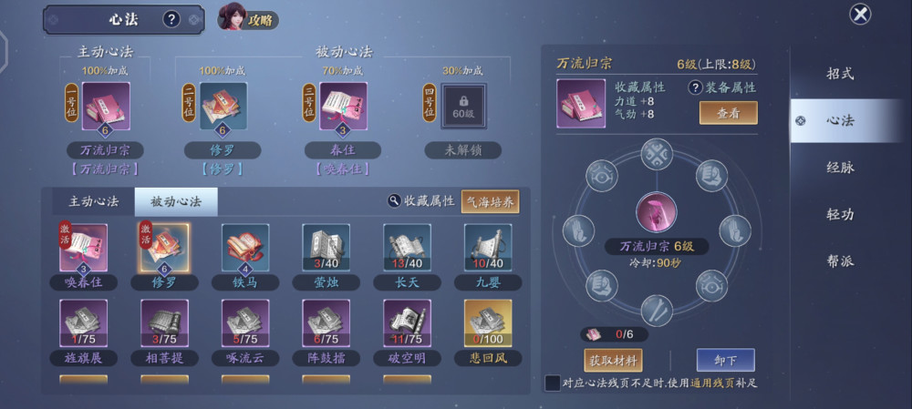 心法被动心法:第二本都是修罗,第三本心法过渡可以选择铁马,加攻击(蓝色心法只需要40个,本体心法和残页通用的话很简单轻松的),攒钱攒绝品心法残页,弄相菩提或者阵鼓擂这个伤害通用(万流归宗没满之前不急),本人奶妈所以选的是春柱,喜欢论剑的可以选择试试‘破空明’紫色通用心法残页不要升万流归宗!非常不划算!万流的心法在摆摊里面买很便宜,残页留着合成紫色心法。
