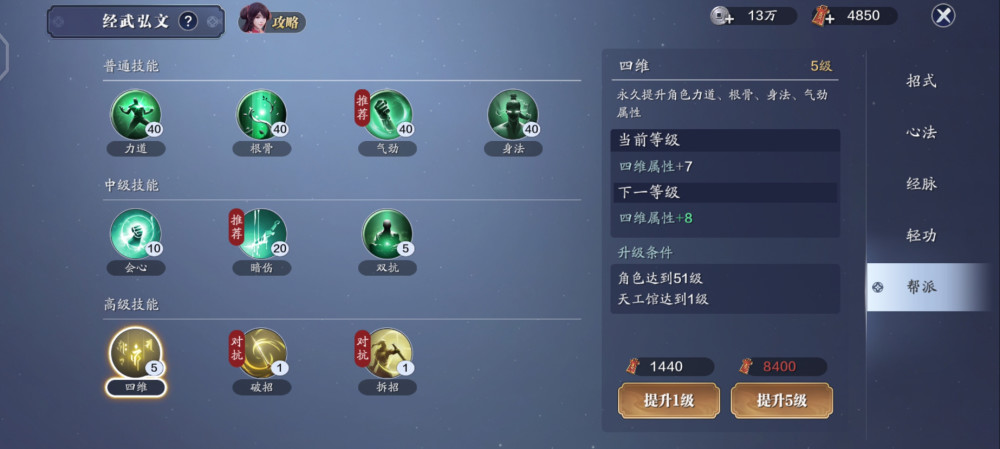 帮派技能,优先把第一排拉满 然后第二排选择自己主属性就行,第三排太花费银子,建议先平均点一点,加的战力也很多。