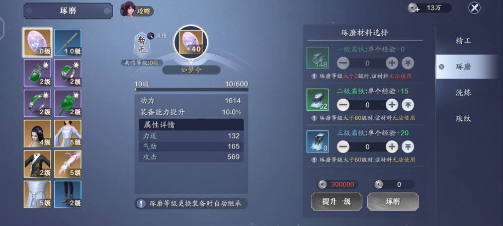 琢磨,这个超级,超级,超级难弄,不说材料,单单碎银就负担不起,而且提升不大,建议平均二级后升级主武器和副武器到10。