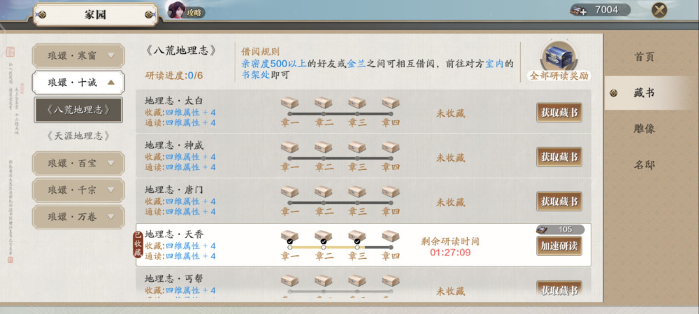 家园读书:建议前期组个金兰 然后把本门派声望拉到最高 获得剑秀 然后与金兰互相读书记得把去室内把所有书架全部做了摆上,要不然放不了书。