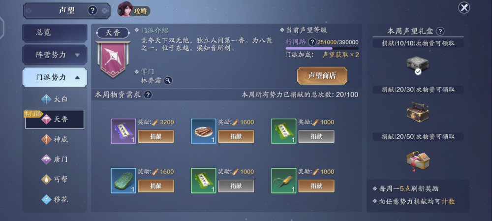 声望: 这个可能很多玩家都忽略了,每天捐赠可以获得资源和相对应的声望。