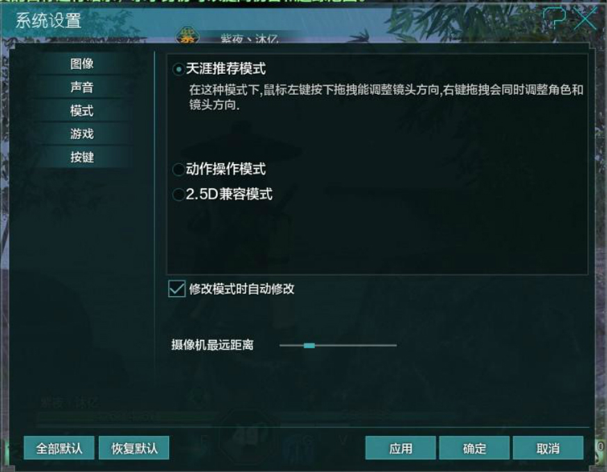 再说一下游戏的操作吧,天刀分为三种操作模式一种是天涯推荐模式模式一种是动作操作模式还有一种是2.5D兼容模式,三种选择总有一款适合你,游戏自身快捷键都是可以修改的,如果与你觉得不顺手,可以改为你习惯的键位。