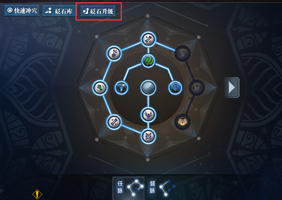 新获取到的砭石默认为1层,可以通过消耗其他不用砭石进行培养升级。在经脉(快捷键:N)中点击砭石升级就可以进行砭石培养拉