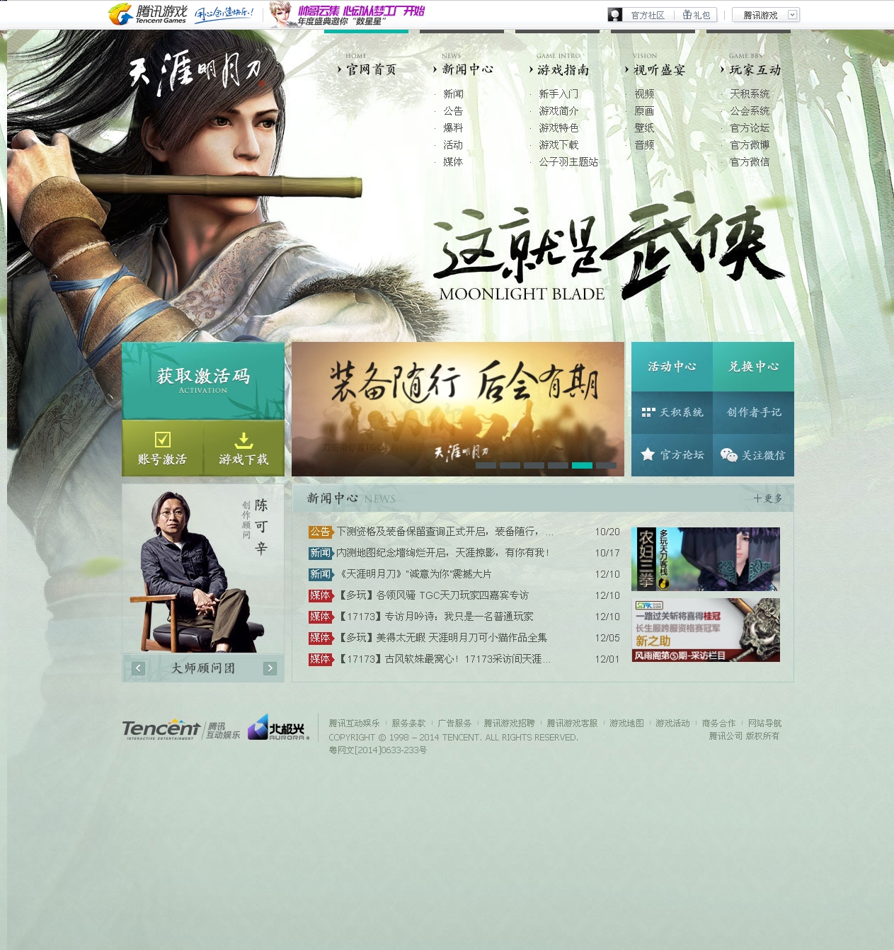 天刀的官网封面走的是简洁明快风格,一张主题图作为背景,配上醒目的游戏名称和版本号,让人一目了然。对游戏的宣传也以视屏广告为主。下方的三个醒目简单的方块板块可以让第一次来到官网的新人准确的找到自己所需的东西。由于游戏还处于测试期,抢激活码和帐号激活自然是玩家最关心的东西,所以也占据了最大最醒目的小方块。